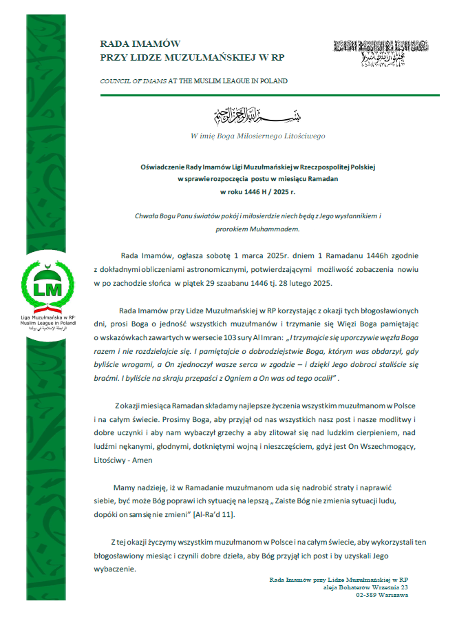 Based on the decision of the European Council for Fatwa and Research, The Council of Imams of the Muslim League in Poland, announces that Saturday 01st March 2025 is the first day of Ramadan 1446h and hence the first day of fasting. We take this opportunity to wish you all a blessed Ramadan, Ramadan Mubarak.